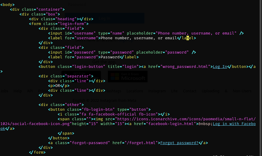 The index.html file must be modified so that instead of redirecting to a page, it sends a POST request to a malicious PHP file that will store the username and password in clear text.