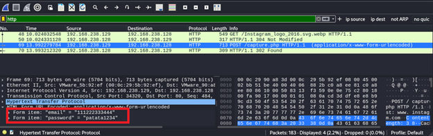 The ARP spoofing and DNS spoofing attack allows us to monitor all packets circulating between the victim machine and the GW. Therefore, we can find those credentials that are transmitted unencrypted by using Wireshark. To do this, we will try to enter www.instagram.com on the victim machine: