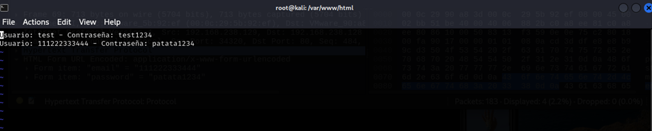With wireshark we have captured the credentials sent in clear text, and on the attacking machine we can see the same credentials captured by the malicious php script:
