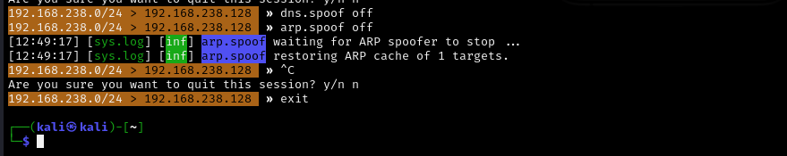 To end the attack, the following commands are executed in Bettercap: