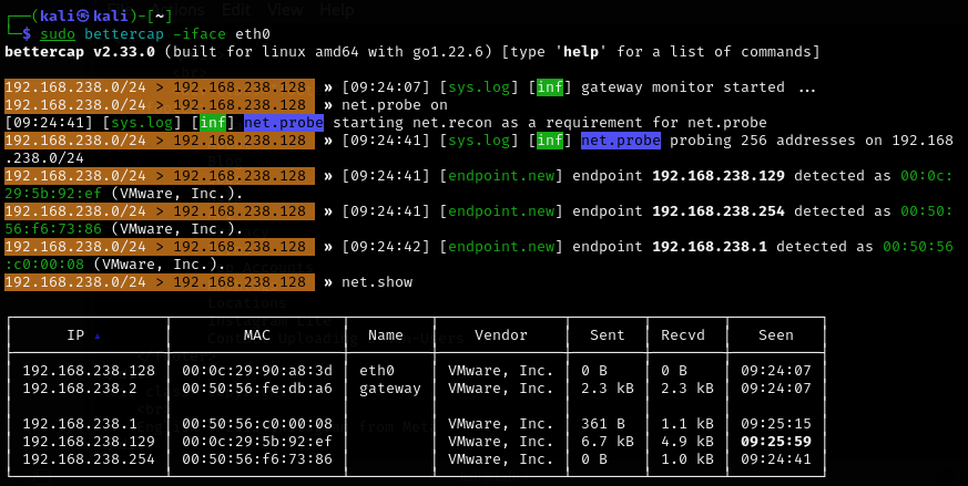 By executing the command “net.probe on”, the tool will start sending packets to “discover” which computers are on the network. With the command “net.show” we can see that it has recognized several other computers, including what will be the victim machine, with IP 192.168.238.129.