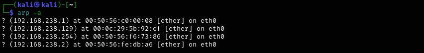 Before executing the attack, let’s examine the information contained in our devices’ ARP tables. To do this, we run the following command: