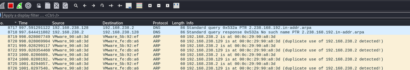 As can be seen, the MAC address of the Gateway is now the same MAC address as that of our attacking machine. In addition, it can be verified that we are in a duplex ARP spoofing using Wireshark. You can see that ARP responses are sent to both the Gateway (“_ARP 192.168.238.129 (Victim) is at [ATTACKING MAC]”) and the victim machine (“_ARP 192.168.238.2 (GW) is at [ATTACKING MAC]”).