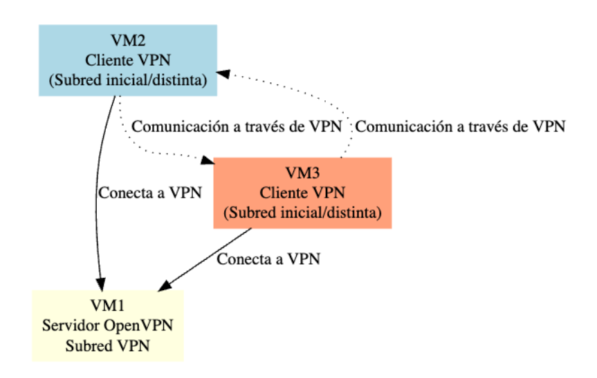 The main objective has been to allow clients (VM1 and VM2), despite being on different physical networks (192.168.20.0/24 and 192.168.10.0/24 respectively), to communicate with each other exclusively through the VPN tunnel (10.8.0.0/24). To achieve this, the necessary certificates and keys have been generated with the easy-rsa tool, the OpenVPN server has been configured and the client-to-client option has been enabled to allow direct communication between clients within the tunnel.