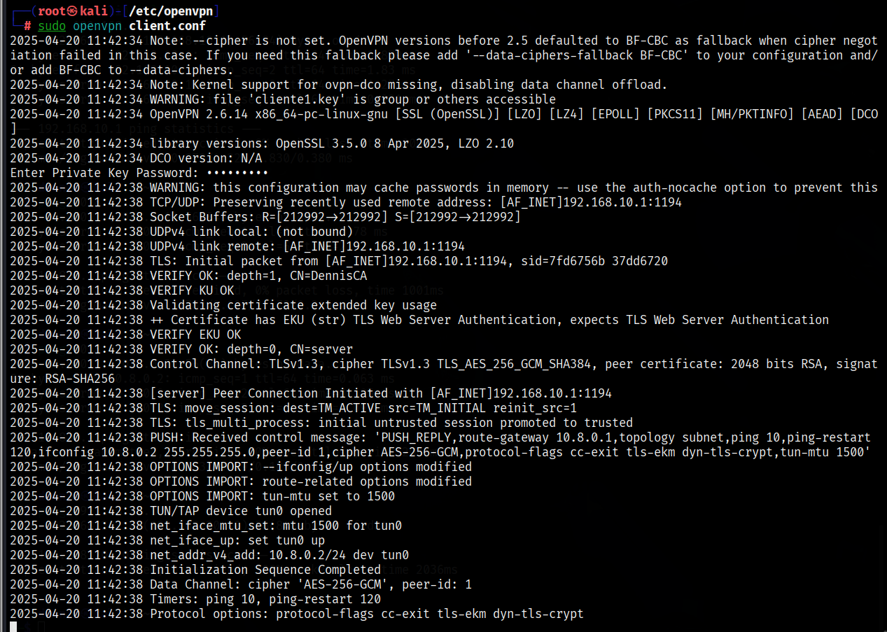 The main objective has been to allow clients (VM1 and VM2), despite being on different physical networks (192.168.20.0/24 and 192.168.10.0/24 respectively), to communicate with each other exclusively through the VPN tunnel (10.8.0.0/24). To achieve this, the necessary certificates and keys have been generated with the easy-rsa tool, the OpenVPN server has been configured and the client-to-client option has been enabled to allow direct communication between clients within the tunnel.