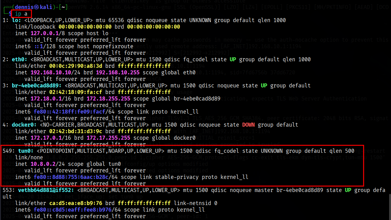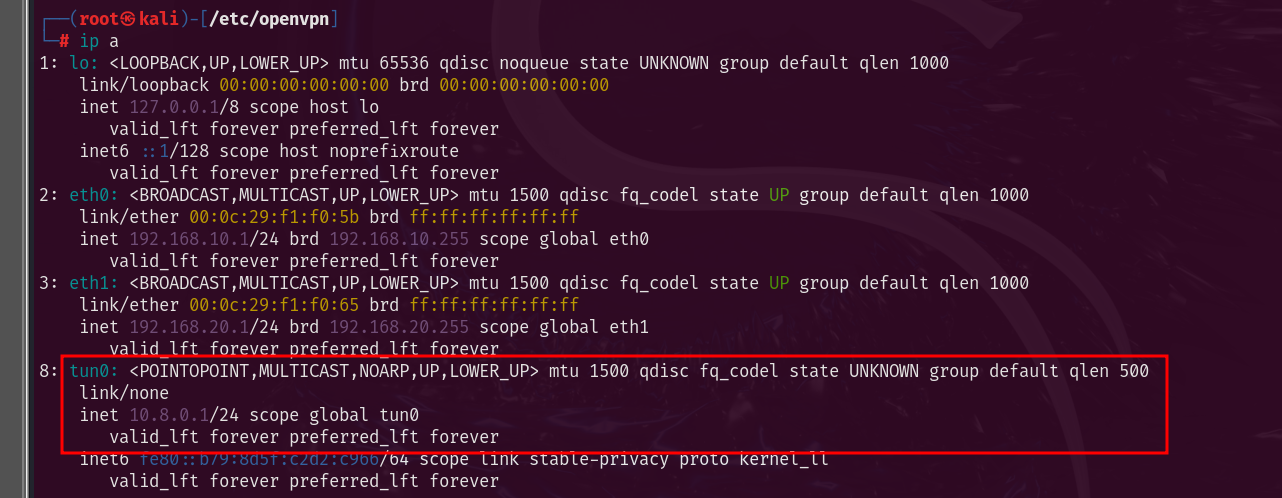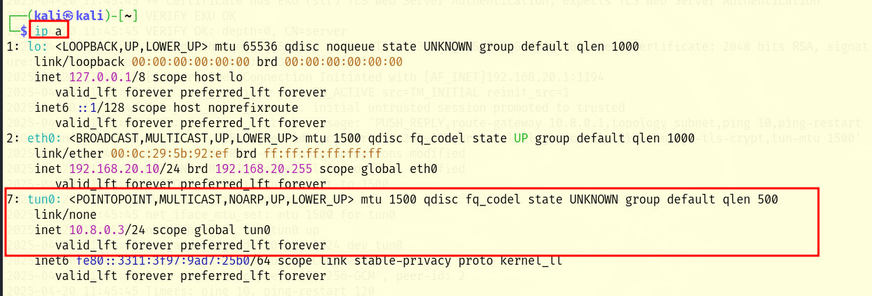 To verify that a new tun0 network virtual interface has been created, you can use the “ip a” command. Tun0 with IP 10.8.0.2 is displayed successfully.