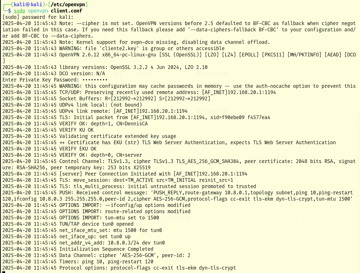 To verify that a new tun0 network virtual interface has been created, you can use the “ip a” command. Tun0 with IP 10.8.0.3 is displayed successfully.
