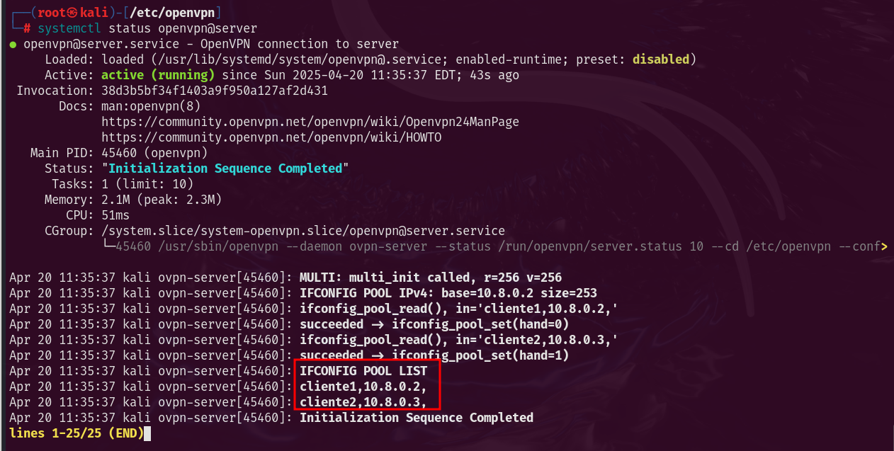 The configuration has been carried out satisfactorily. Now all that remains is to start the openVPN services on both client machines, executing the command: