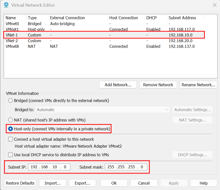 First, the two virtual networks are created in VMWare: