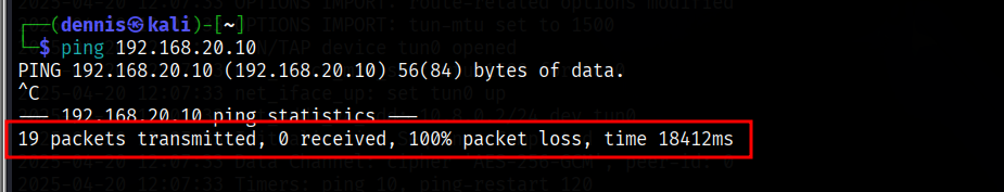 The 192.168.10/24 and 192.168.20/24 subnets are completely isolated and no routing rules have been added to the server, so clients cannot communicate before connecting to the VPN. This is shown by attempting to ping client 1 to client 2: