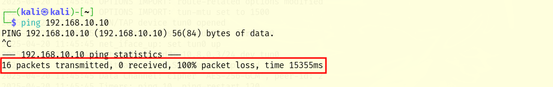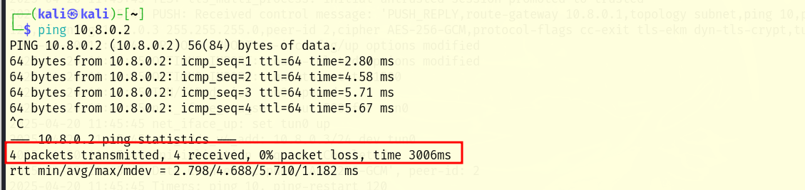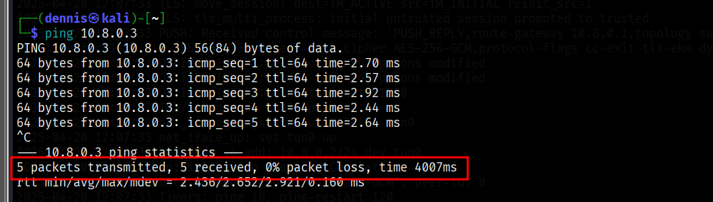 However, through the tun0 tunnel they do have a connection. Trying to ping from client 1 to client 2 through the tunnel, i.e. IP 10.8.0.3, you do have a connection: