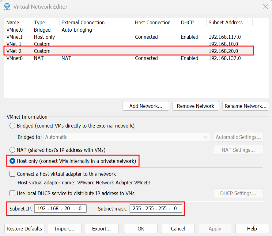 - Gateway: 192.168.20.1 (the IP of the adapter in VM3)