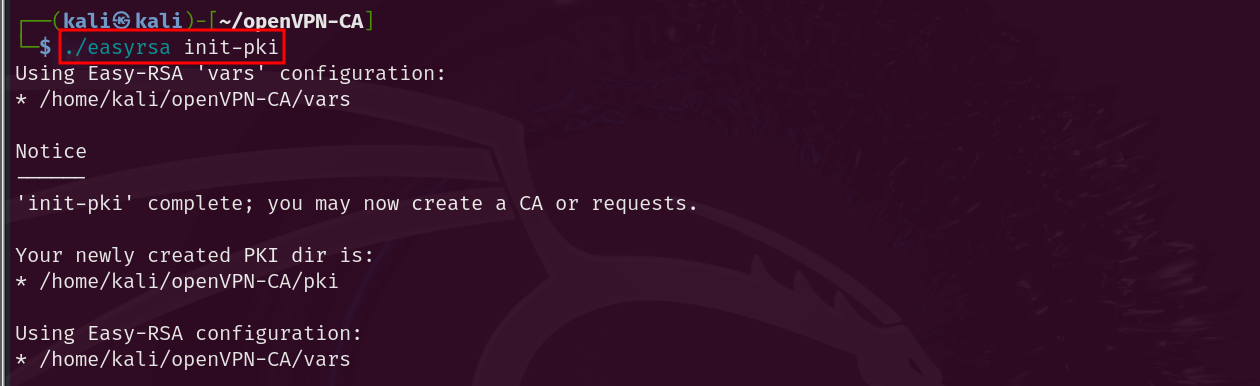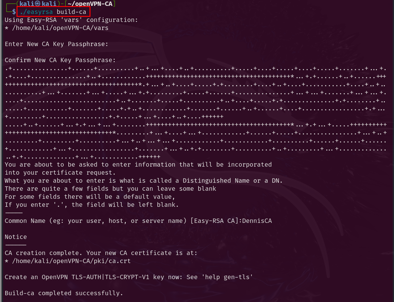The following command is then executed to start the PKI and build the CA: