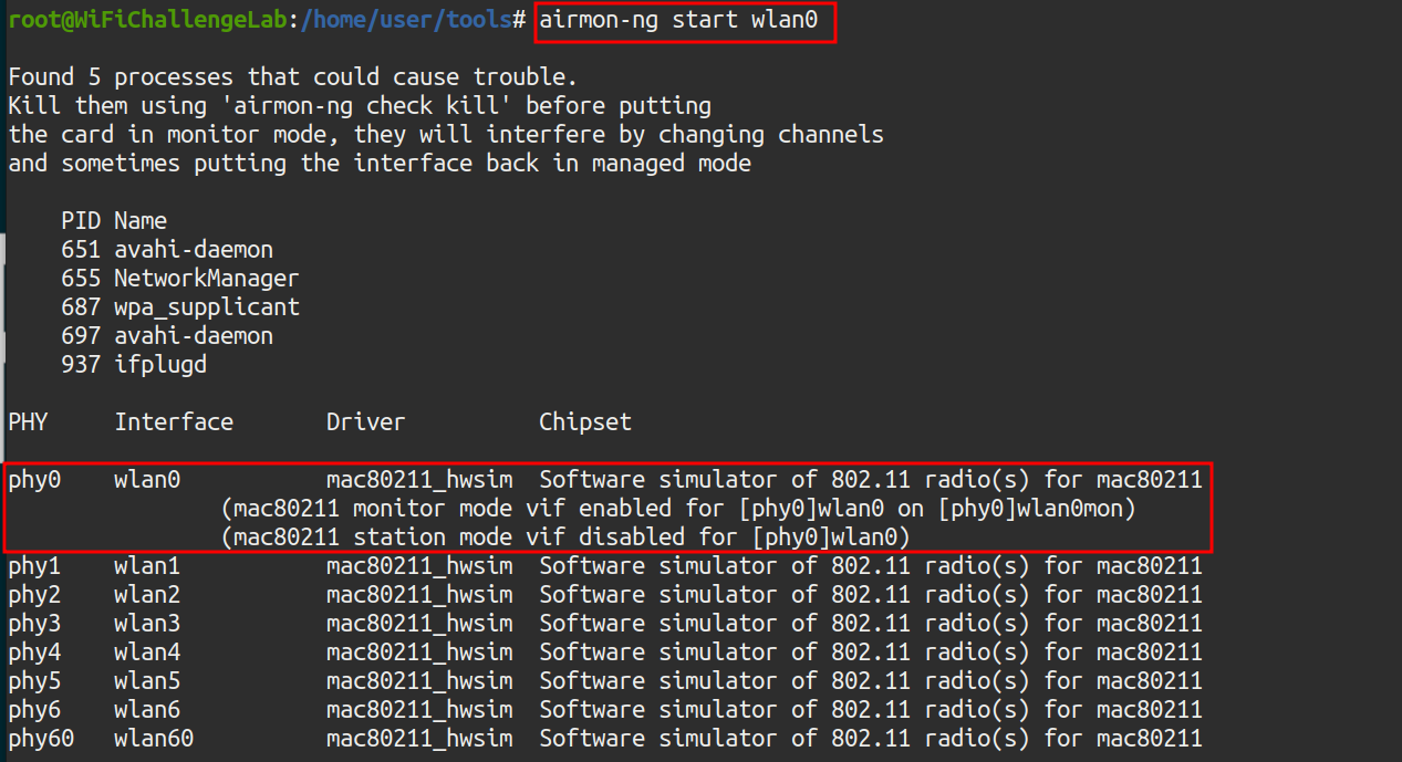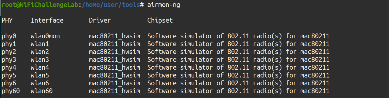 To scan the environment, it is necessary to employ a network interface in monitor mode. To do this, the airmon-ng tool is used. To check which network interfaces are installed, you can run the “airmon-ng” command without arguments: