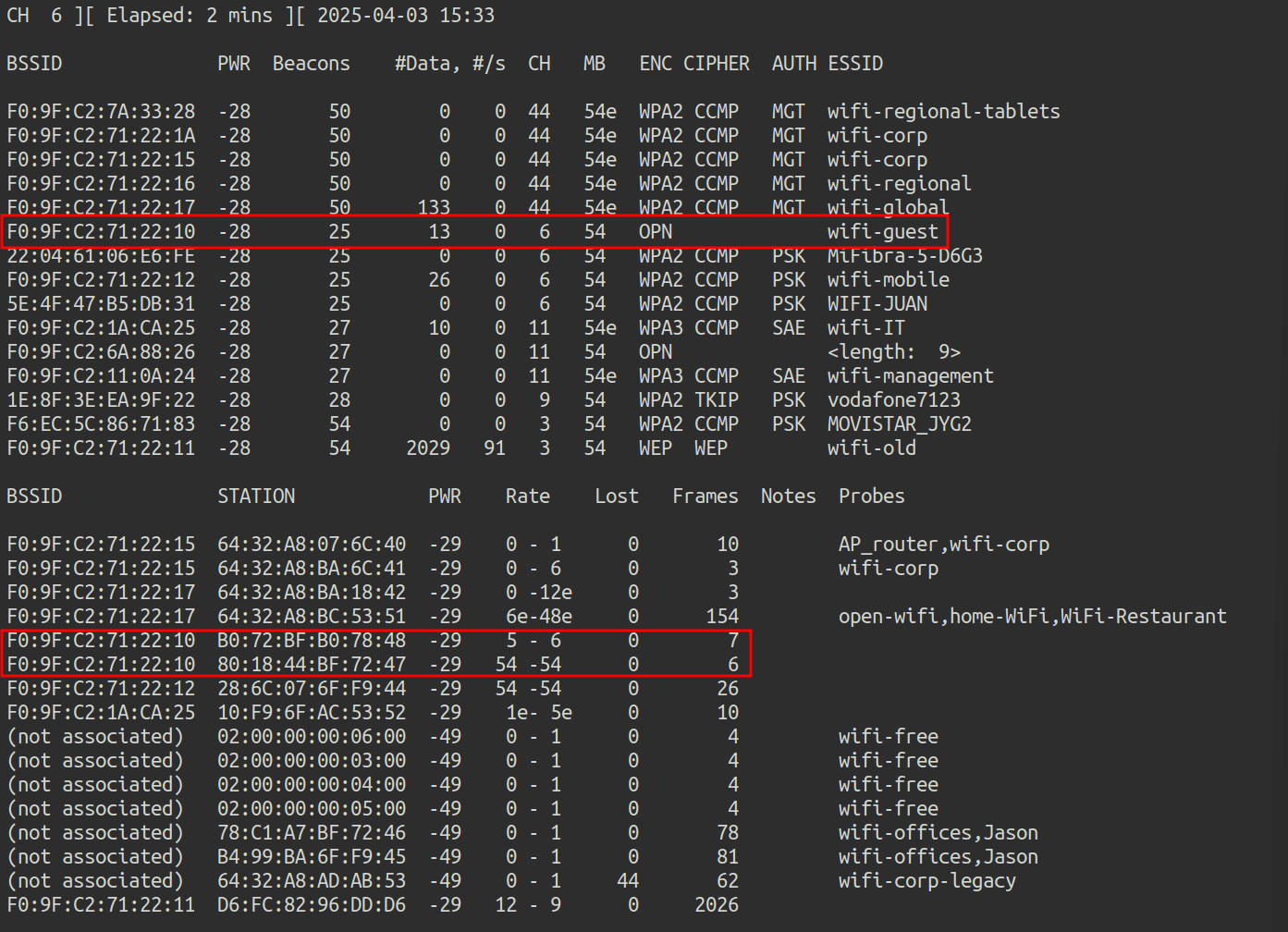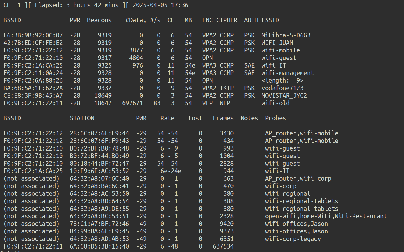We do not have the passwords, so one of the customers connected to the Wi-Fi guest network will be challenged. To do this, airodump-ng is executed on all channels in search of the MACs of the clients of the Wi-Fi guest network: