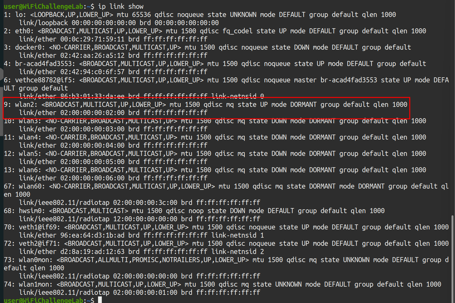 This command displays all network interfaces in the system (both physical and virtual), along with their status (enabled, disabled, MAC address, etc.). In this case, the MAC of our wlan2 interface is as follows:
