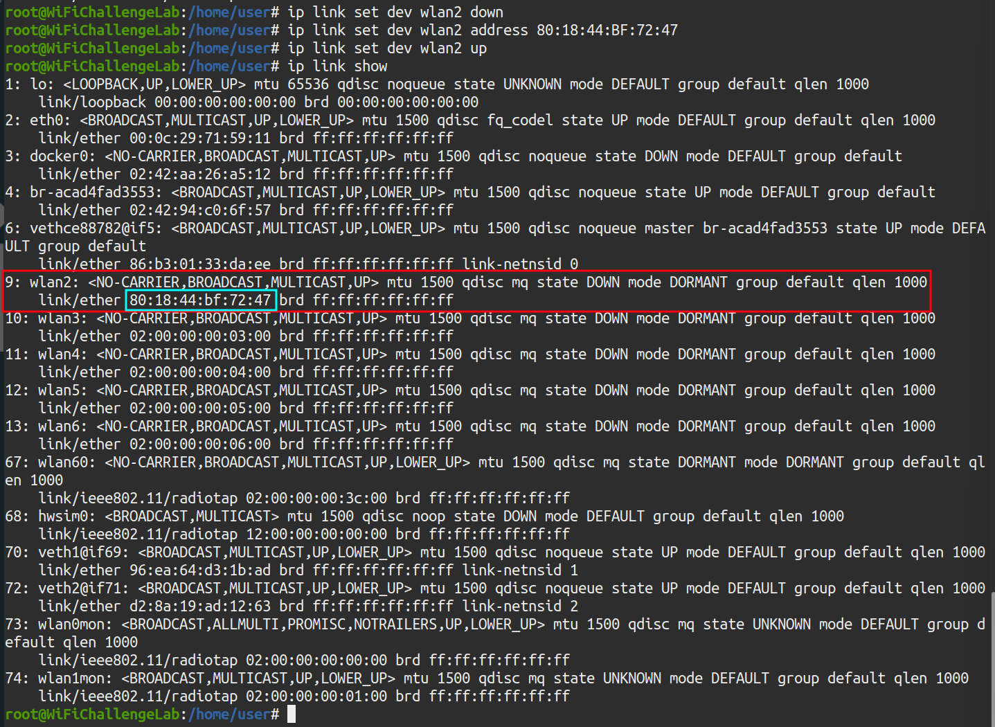 Our wlan2 device appears with its original MAC: 02:00:00:00:20:00. The following commands are then executed as root to change the MAC: