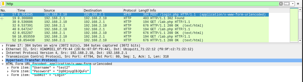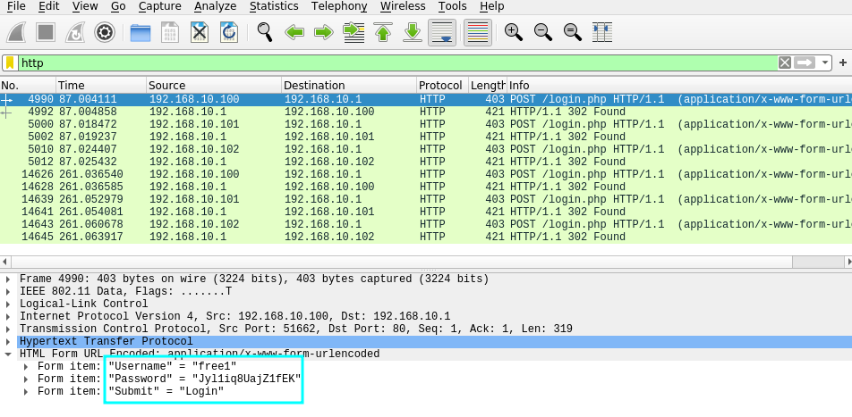 However, now the default admin/admin credentials do not reveal the flag: you have to find the credentials of another user. However, as it is an open network, the traffic is not encrypted, so it can be captured with airodump and then inspected with wireshark for credentials. First, a capture is generated with airodump-ng: