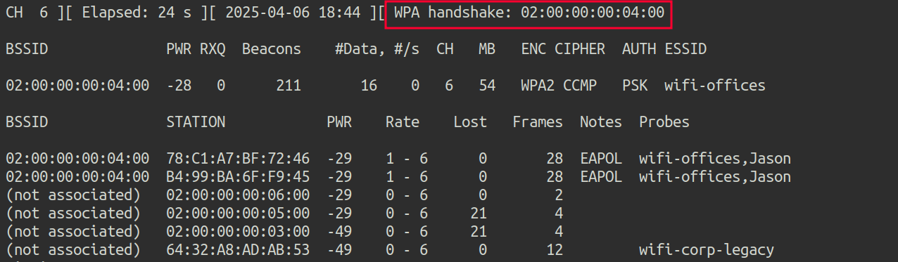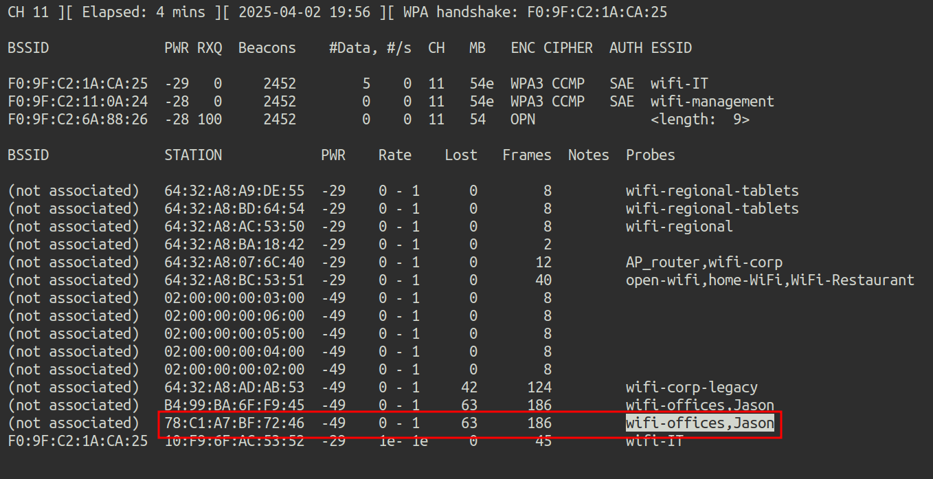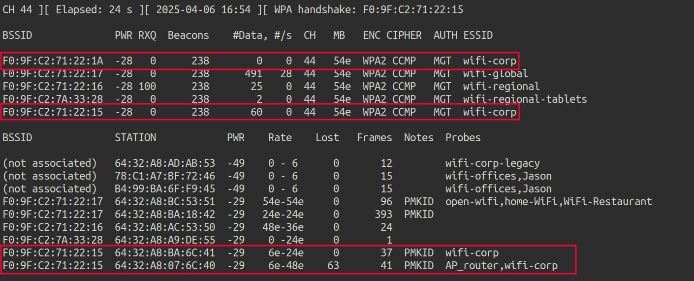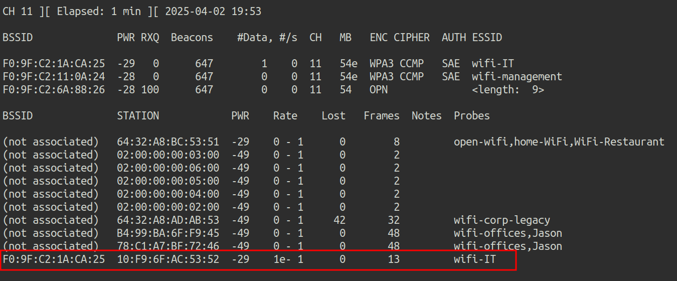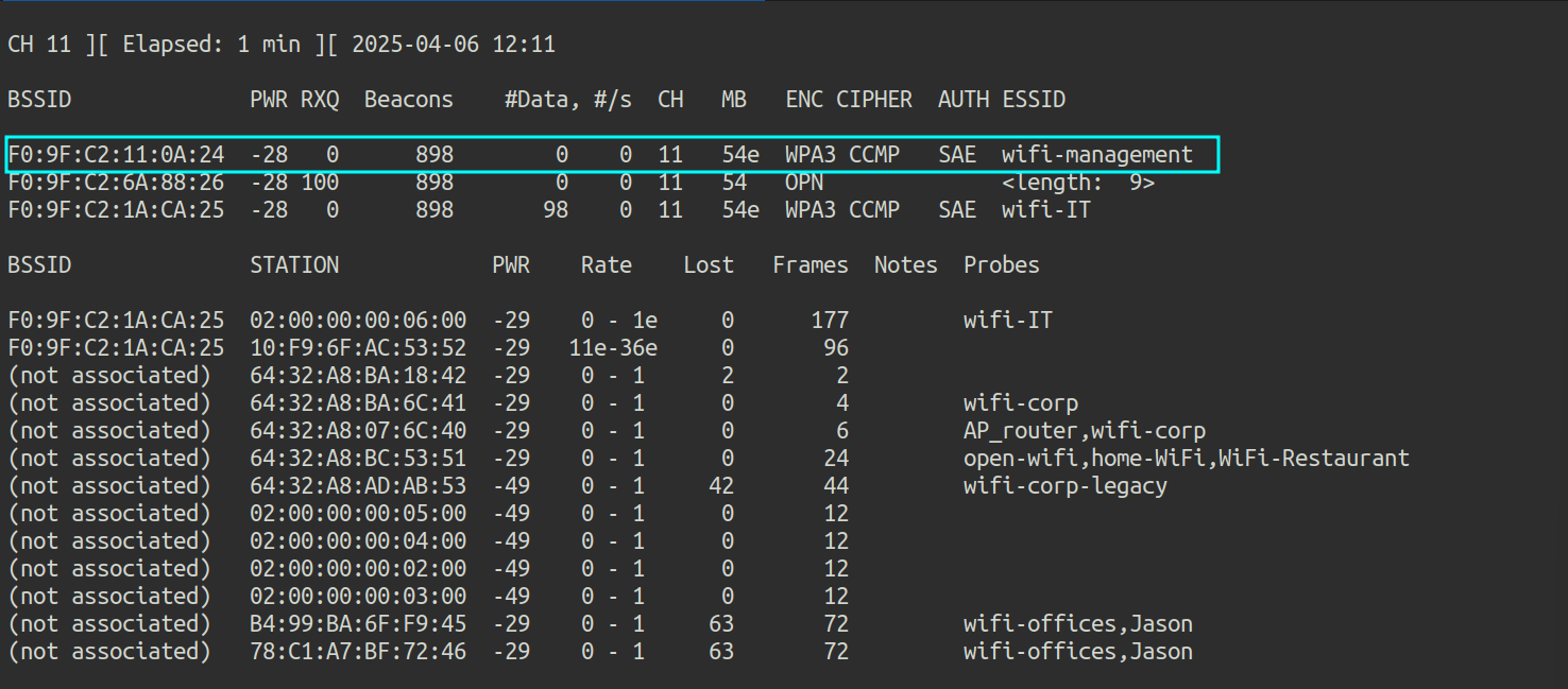 First, airodump-ng is launched to check if there are any clients connected to wifi-corp:
