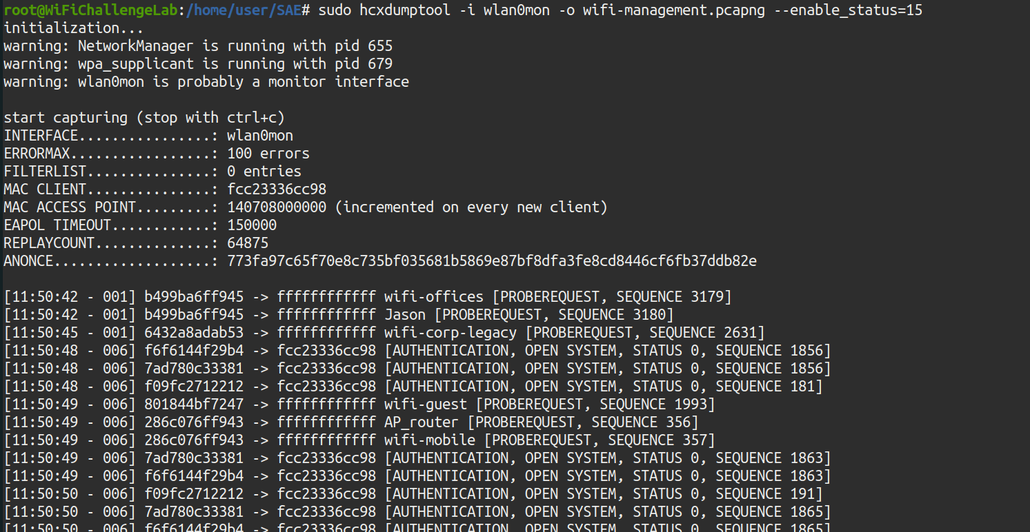 sudo hcxdumptool -i wlan0mon -o wifi-management.pcapng --enable_status=15