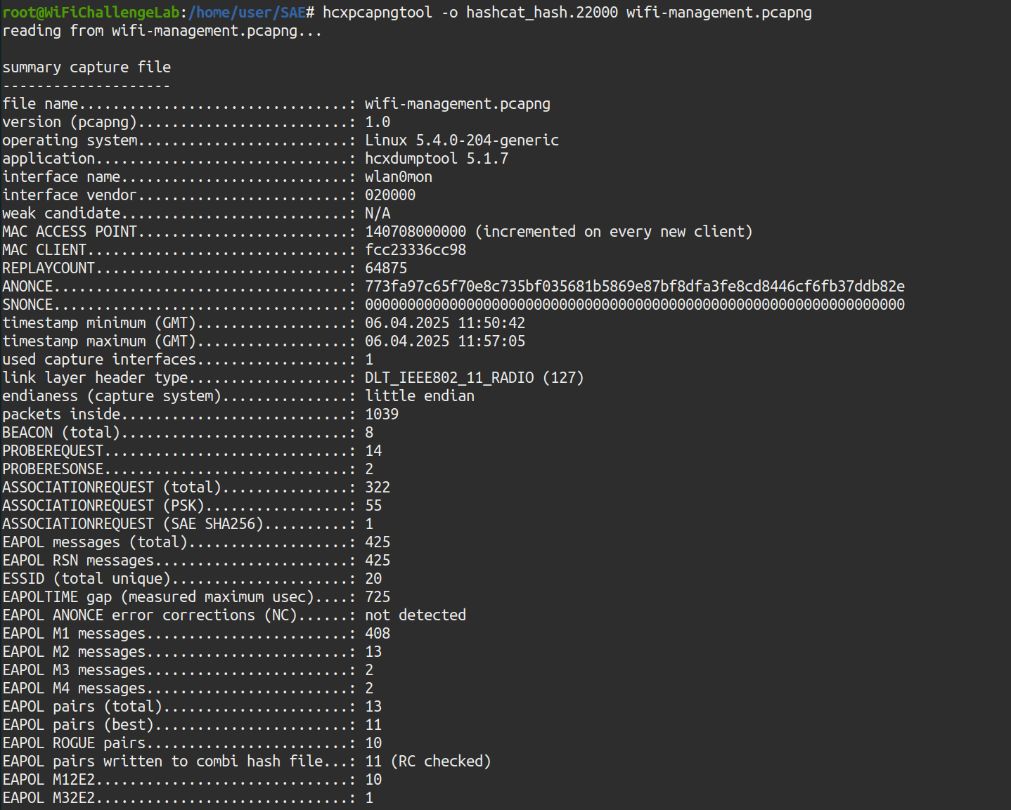 hcxpcapngtool -o hashcat_hash.22000 wifi-management.pcapng