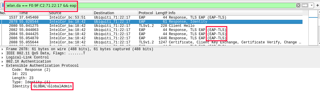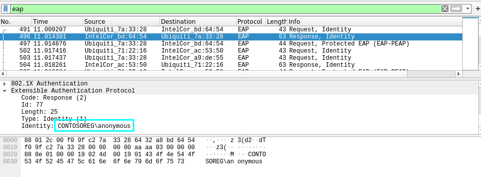 By applying the “eap” filter, the domain of the users of the Wi-Fi regional network is extracted in clear text: CONTOSOREG.