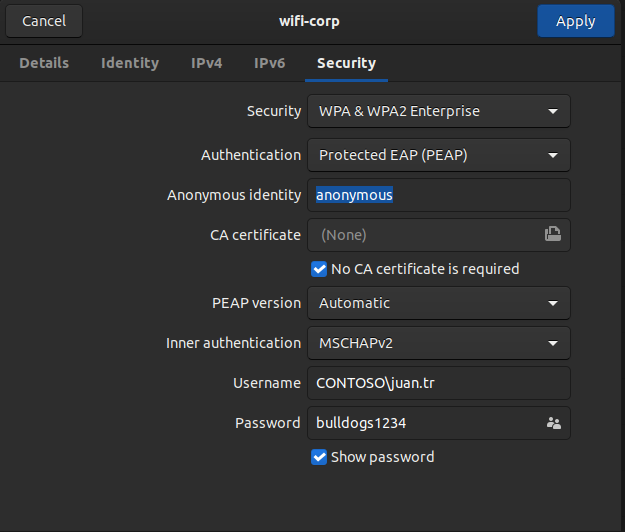 The password has been successfully cracked: bulldogs1234. With this, we can connect to the network with the following configuration:
