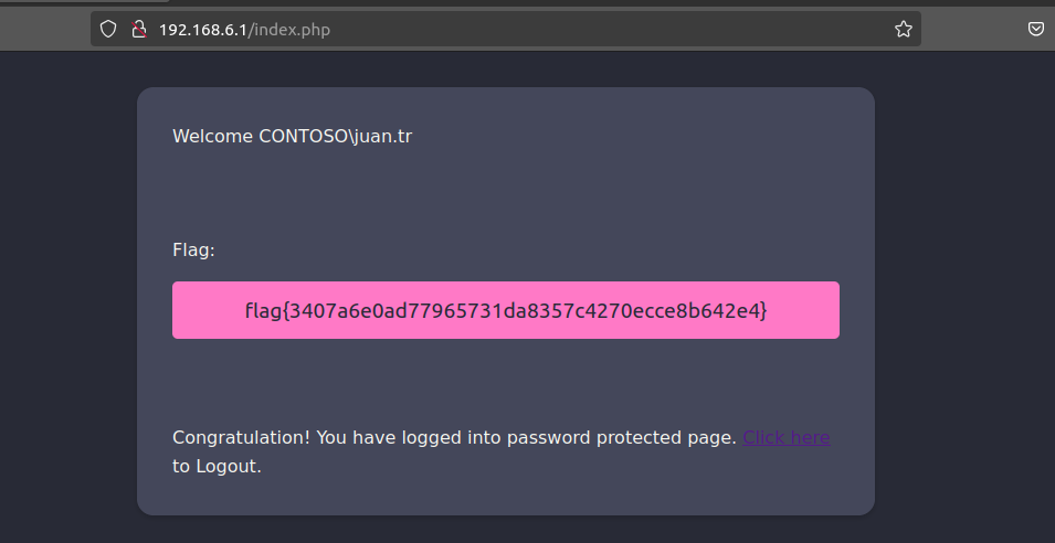 By accessing the AP website (192.168.6.1), and logging in with CONTOSO\juan.tr::bulldogs1234 credentials, we can get the following flag: