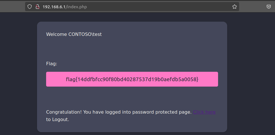 Now, if you log in to the AP administration website, 192.168.6.1 with the credentials CONTOSO\test::monkey, you get the flag: