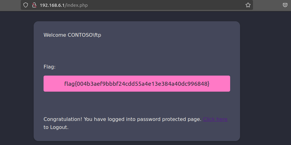 Earned the credentials: “CONTOSO\ftp:12345678”. By logging in to the AP administration website, 192.168.6.1, you get the flag: