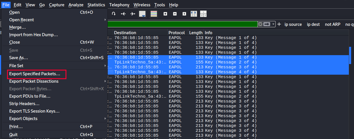 By applying the EAPOL filter, you can select the 4 frames of the 4-way handshake and export them. To do this, the desired packages are selected and those packages are exported.