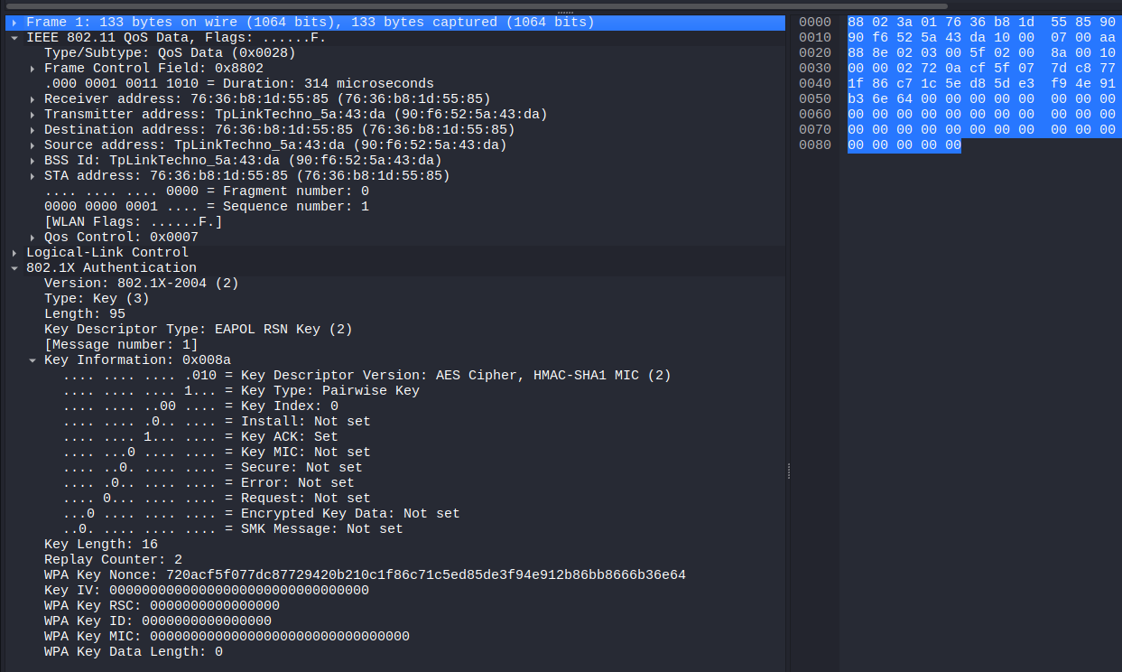 - WPA Key Nonce (ANonce): 720acf5f077dc87729420b210c1f86c71c5ed85de3f94e912b86bb8666b36e64. This random number has been generated by the AP and will be used, along with other parameters (such as the AP’s MAC address, the client’s MAC address, and the client’s SNonce), to derive the PTK (Pairwise Transient Key).