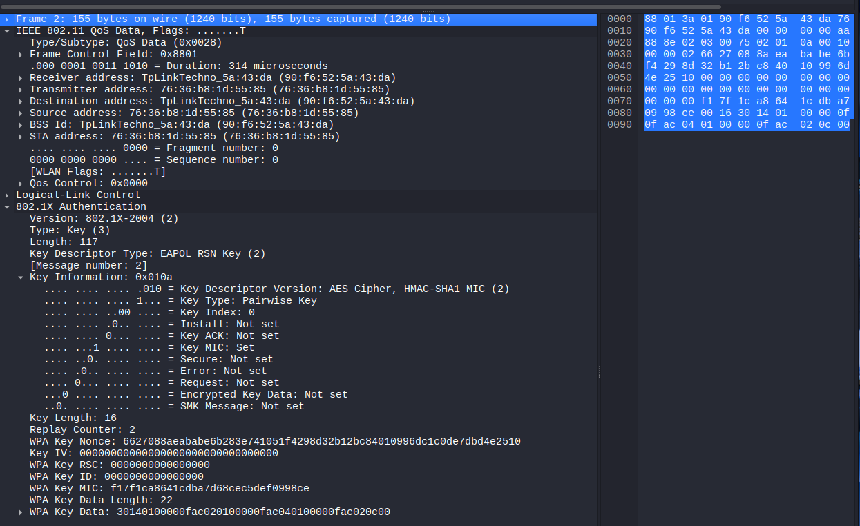 The same package also includes the SNonce in clear format, i.e. unencrypted, since the secure association process has not yet been completed. Despite this, the MIC assures that the content of the message has not been modified during transmission.