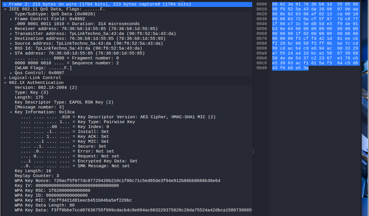 This third packet is sent again by the access point (AP) to the client (STA), and its main purpose is to confirm the validity of the MIC received in the previous message and, in addition, to provide the temporary group key (GTK) in encrypted form. From this point, both parties should have already correctly calculated the PTK (Pairwise Transient Key), allowing them to start encrypting some of the message content.