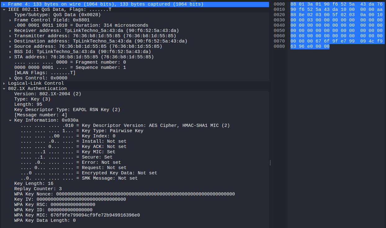 In addition, the value of the Replay Counter field has been increased to 3, following the order of the handshake and ensuring that previous broadcasts are not accepted, which protects against replay attacks.