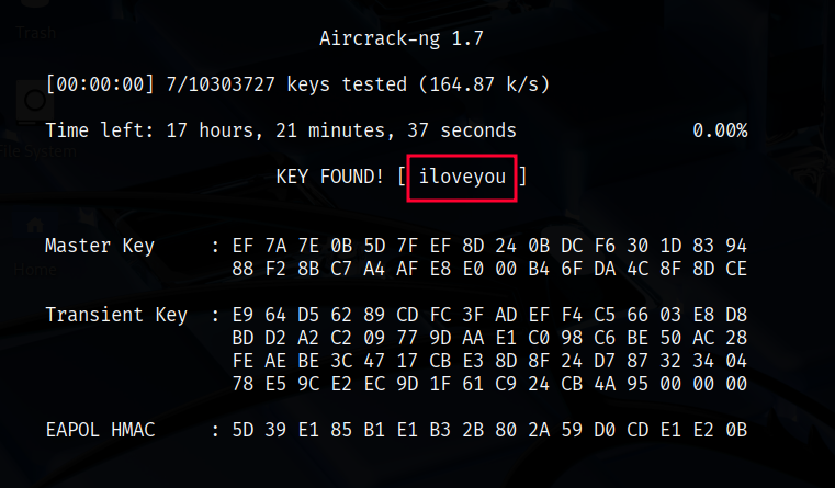 The result is as expected; Aircrack-ng has found the password present in the dictionary: iloveyou.