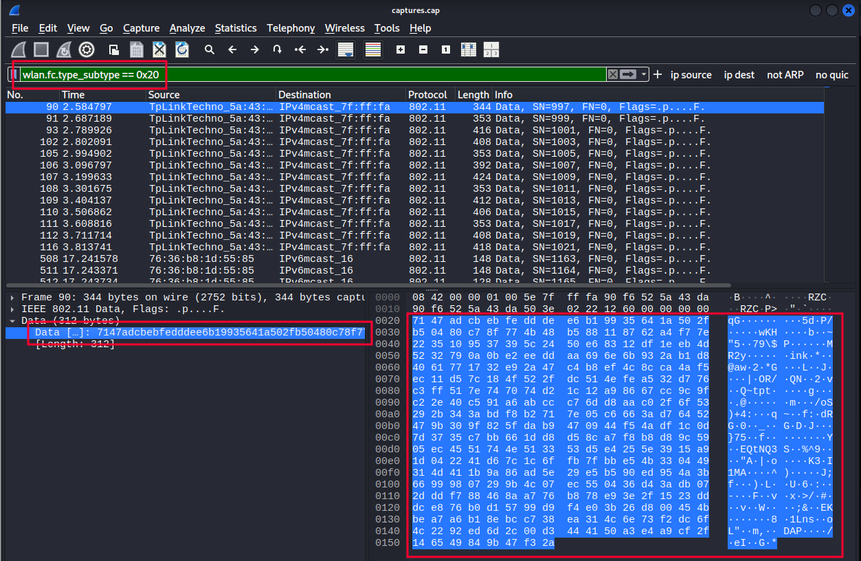 Before decrypting packets, subtype data frames can be analyzed 0x20. The content does not make any sense, since it is encrypted. To do this, the wireshark filter “wlan.fc.type_sybtype == 0x20” has been applied: