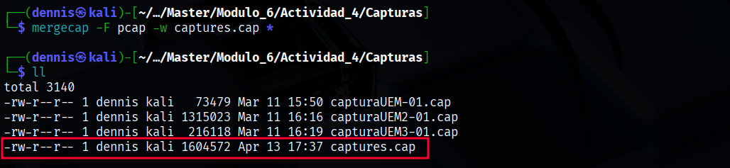 First, all the captures have been put together into one using the “mergecap” tool. To do this, the following command has been executed: