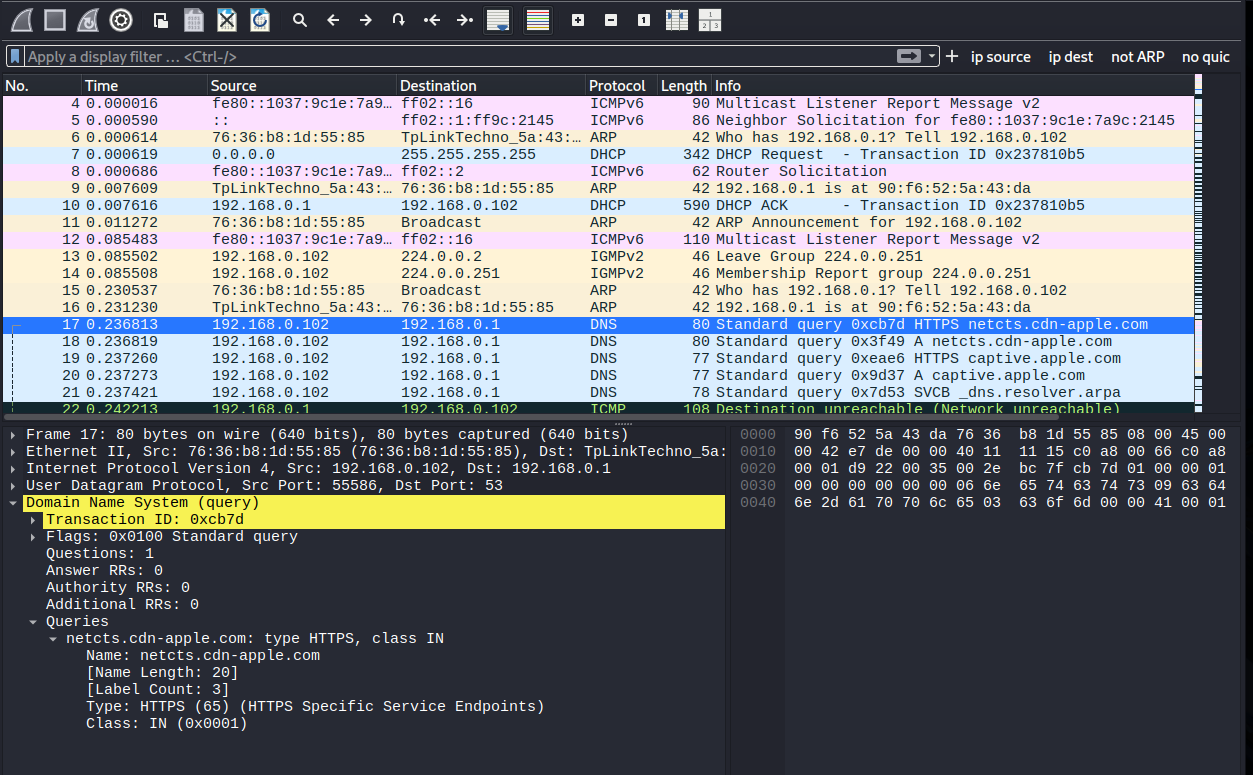 After decrypting the data packets, the familiar protocols DHCP, ARP, ICMP appear in Wireshark… This is a confirmation that the packets have been successfully decrypted.