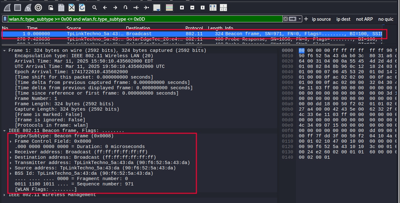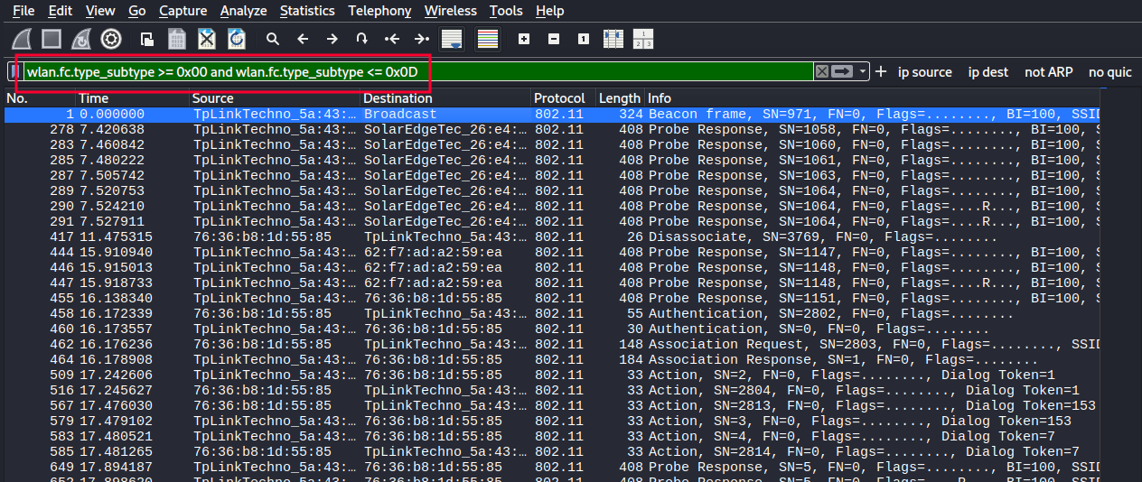 | 00 | 1000 | Beacon | wlan.fc.type_subtype == 0x08 |